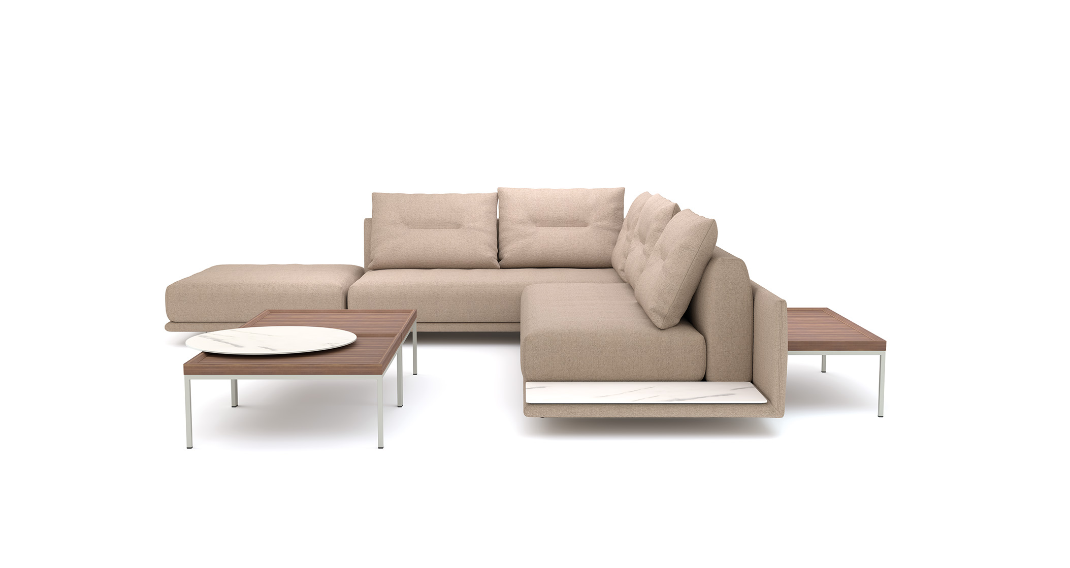 Olgu see üksikdiivan, kaheosaline lahendus või avar elamisnurk – elemente saab kasutada eraldi või ühendada omavahel, et kujundada kaasaegse arhitektuuri avatud stiilis sisekujundus. Raam, polsterdus ja vabalt paigutatavad seljatoepadjad on saadaval erinevates materjalides ja toonides, võimaldades luua elegantse „mix & match“ kombinatsiooni.